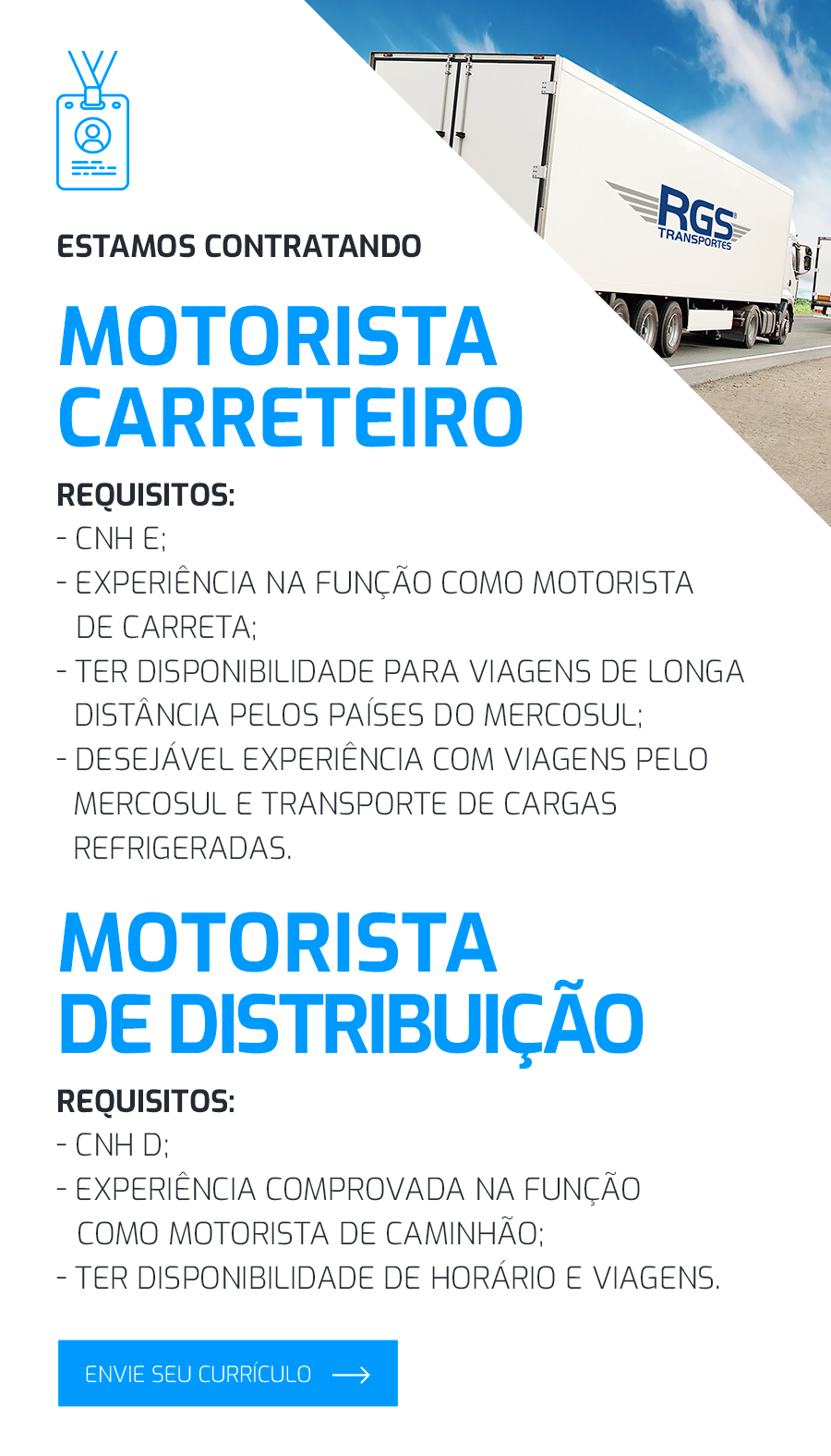 Nascida em Piracicaba, interior de São Paulo, inicialmente atendia exclusivamente a demanda da Bom Peixe. A RGS Transportes cresceu rápido e se tornou referência em transporte rodoviário internacional de cargas, passando a atender a grande demanda de clientes que necessitam escoar seus produtos para o Mercosul com qualidade, segurança e agilidade.